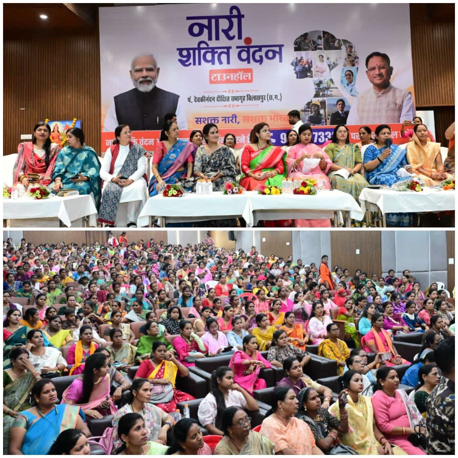 बिलासपुर // न्यायधानी बिलासपुर में नारी शक्ति वंदन कार्यक्रम का भव्य आयोजन लालबहादुर शास्त्री स्कूल स्थित देवकीनंदन दीक्षित सभागार में किया गया। कार्यक्रम में नारी शक्ति वंदन अधिनियम के तहत महिलाओं को विधानसभा और लोकसभा में 33 प्रतिशत आरक्षण दिए जाने के प्रावधान का स्वागत करते हुए कार्यक्रम में मौजूद महिलाओं ने प्रधानमंत्री नरेंद्र मोदी के प्रति आभार व्यक्त किया। कार्यक्रम में हजारों की संख्या में महिलाएं महापौर पूजा विधानी एवं राज्य महिला आयोग की पूर्व अध्यक्ष हर्षिता पांडे की अगुवाई में शामिल हुई। सभागार महिलाओं की भारी उपस्थिति से खचाखच भरा रहा और पूरे कार्यक्रम में उत्साह का वातावरण बना रहा।
