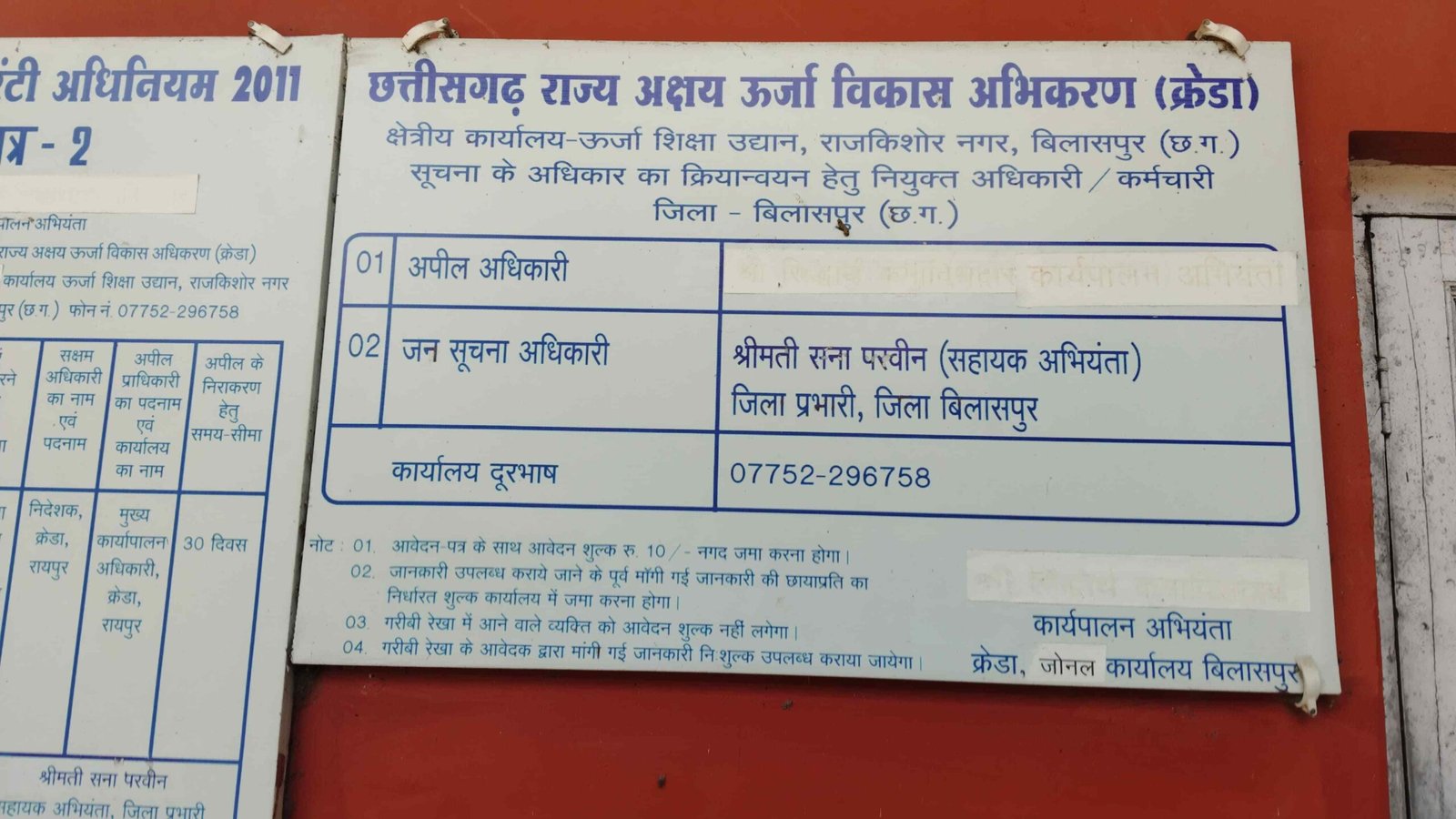 नियमतः प्रत्येक सरकारी कार्यालय के बाहर सूचना पटल पर जन सूचना अधिकारी और प्रथम अपीलीय अधिकारी का नाम व मोबाइल नंबर अंकित होना अनिवार्य है। लेकिन क्रेडा के इस जोनल कार्यालय के बाहर लगे बोर्ड पर किसी भी जिम्मेदार का नाम-नंबर दर्ज नहीं है। बोर्ड पर एक मात्र लैंडलाइन नंबर मौजूद है, जो तकनीकी रूप से ‘आउट ऑफ कवरेज’ या ‘सुविधा में नहीं’ है।