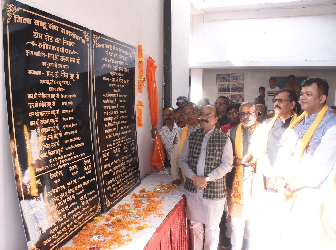 रायपुर :— उप मुख्यमंत्रीअरूण साव साहू सदन राजनांदगांव में आयोजित साहू समाज के छत्तीसगढ़ राज्य स्तरीय युवक-युवती परिचय सम्मेलन एवं शपथ ग्रहण समारोह कार्यक्रम में शामिल हुए। इस अवसर पर उप मुख्यमंत्री श्री अरूण साव ने साहू सदन परिसर में मां कर्मा मंदिर जीर्णोद्धार और डोम शेड का लोकार्पण किया। उप मुख्यमंत्री श्री साव ने युवक-युवती परिचय सम्मेलन में शामिल होने वाले युवक-युवतियों को बधाई एवं शुभकामनाएं दी और उनके उज्ज्वल भविष्य की कामना की। कार्यक्रम में रायपुर ग्रामीण विधायक श्री मोतीलाल साहू, कसडोल विधायक श्री संदीप साहू, अध्यक्ष छत्तीसगढ़ तेलघानी बोर्ड श्री जितेन्द्र साहू, उपाध्यक्ष जिला पंचायत श्रीमती किरण साहू, अध्यक्ष प्रदेश साहू संघ डॉ. नीरेन्द्र साहू, अध्यक्ष जिला साहू संघ श्री भागवत साहू सहित जनप्रतिनिधि व साहू समाज के पदाधिकारीगण, बड़ी संख्या में साहू समाज के युवक-युवती व समाज के सदस्य उपस्थित थे।