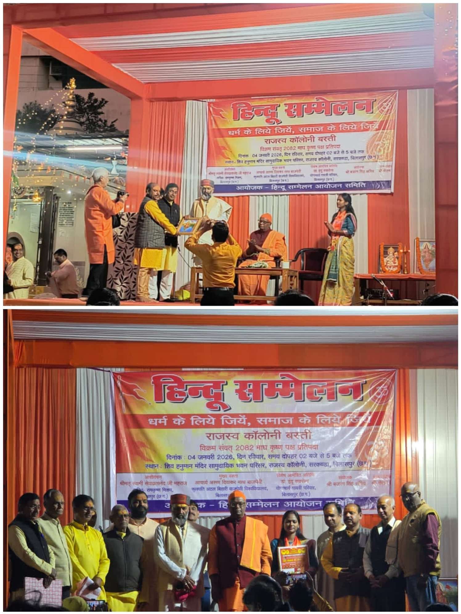 बिलासपुर :— दिनांक 04 जनवरी 2026 को राजस्व कालोनी बस्ती में हिन्दू सम्मेलन का भव्य आयोजन किया गया जिसमें राजस्व कालोनी, संजय हाइट्स, कपिलनगर, चांटीडीह, सागर शिखर, कमलाश्री, ड्रीम इंपीरिया जीवाजी हाईट्स के गणमान्य बंधुगण एवं मातृशक्यिां लगभग 400-450 की संख्या में सपरिवार उपस्थित रहे। उक्त कालोनियों के प्रतिभाशाली बच्चों, मातृशक्ति एवं बंधुओं द्वारा भारतीय संस्कृति पर आधारित विभिन्न आकर्षक धार्मिक व देशभक्ति से ओतप्रोत कार्यक्रमों की प्रस्तुति दी गई जिसकी माननीय अतिथिगण एवं उपस्थित नागरिकों द्वारा भूरि-भूरि प्रशंसा की गई। सांस्कृतिक कार्यक्रम के पश्चात् अतिथिगण आचार्य अरूण दिवाकर नाथ बाजपेयी कुलपति अटल बिहारी वि0वि0 बिलासपुर, श्रीमत् स्वामी सेवाव्रतानंद जी सचिव रामकृष्ण मिशन कोनी बिलासपुर, एवं डा. इन्दू सक्सेना योगाचार्य गायत्री परिवार का उद्बोधन सनातन हिन्दू संस्कृति/संस्कार के परिप्रेक्ष्य में प्राप्त हुआ।