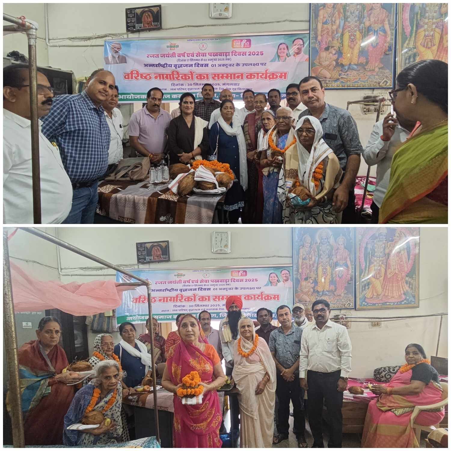 बिलासपुर // समाज कल्याण विभाग बिलासपुर द्वारा रजत जयंती समारोह एवं सेवा पखवाड़ा के अन्तर्गत कल्याण कुंज वृद्धाश्रम एवं सुवाणी प्रशामक देख-रेख गृह जोरापारा में वृद्धजनों का शाल,श्रीफल और फूल-माला से सम्मान किया जा कर फल वितरण किया गया। इस अवसर पर पूजा विधानी, महापौर बिलासपुर ने मुख्यअतिथि के रूप में उपस्थित होकर वरिष्ठजनों का सम्मान करते हुये कहा कि वर्तमान समय में वरिष्ठजनों का जीवनयापन काफी कठिन हो गया है। आज हम सबको ऐसा प्रयास करना चाहिये कि हमारे वरिष्ठजनों को उनके परिवार में ऐसा वातावरण का निर्माण हो कि उन्हें आश्रम जाने की नौबत न आये। वृद्धाश्रम में सभी वरिष्ठजनों का मुख्य चिकित्सा एवं स्वास्थ्य अधिकारी के चिकित्सकों द्वारा स्वास्थ्य परीक्षण किया जा कर उनके आवश्यकतानुसार दवाईया वितरित की गई। श्री टी.पी. भावे, संयुक्त संचालक ने विभाग द्वारा वरिष्ठजनों के लिये संचालित योजनाओं के बारे मे जानकारी दी। इस अवसर पर कृपाल सिंह भोगल, अमित तिवारी वार्ड पार्षद, कल्याण कुंज आश्रम के अध्यक्ष सुभाष अग्रवाल, नित्यानंद अग्रवाल, सतीश शाह, डॉ. पमलेश साहू, डॉ. अब्दुल रज्जाक खान, सीता सोन्थालिया, डॉ. सत्यभामा अवस्थी, अरूणा दिक्षीत, प्रशांत मोकासे, विजय केशकर, दादुलाल बरेठ,राजेश सिसोदिया, राधेश्याम यादव, सौरभ दीवान, कृष्णा सिलारपू, संतोष केशरवानी एवं प्रधान का सहयोग सराहनीय था।