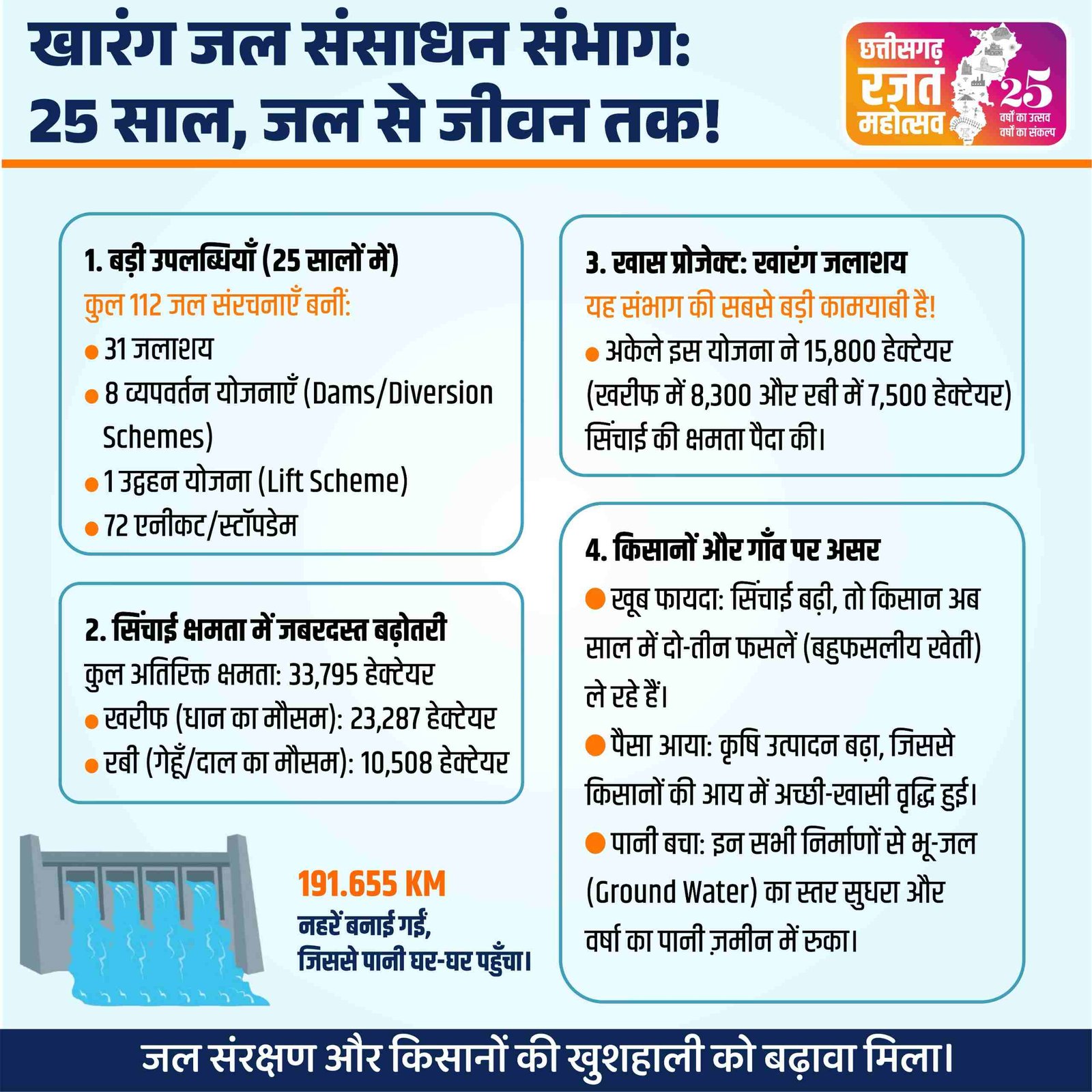 बिलासपुर // जिले में वर्ष 2000 से 2025 तक के पच्चीस वर्षों में खारंग जल संसाधन संभाग ने प्रदेश की जल संसाधन विकास योजनाओं में अग्रणी भूमिका निभाई है। इस अवधि में संभाग ने जल संरक्षण, सिंचाई क्षमता विस्तार एवं कृषि विकास की दिशा में उल्लेखनीय उपलब्धियाँ अर्जित की हैं।