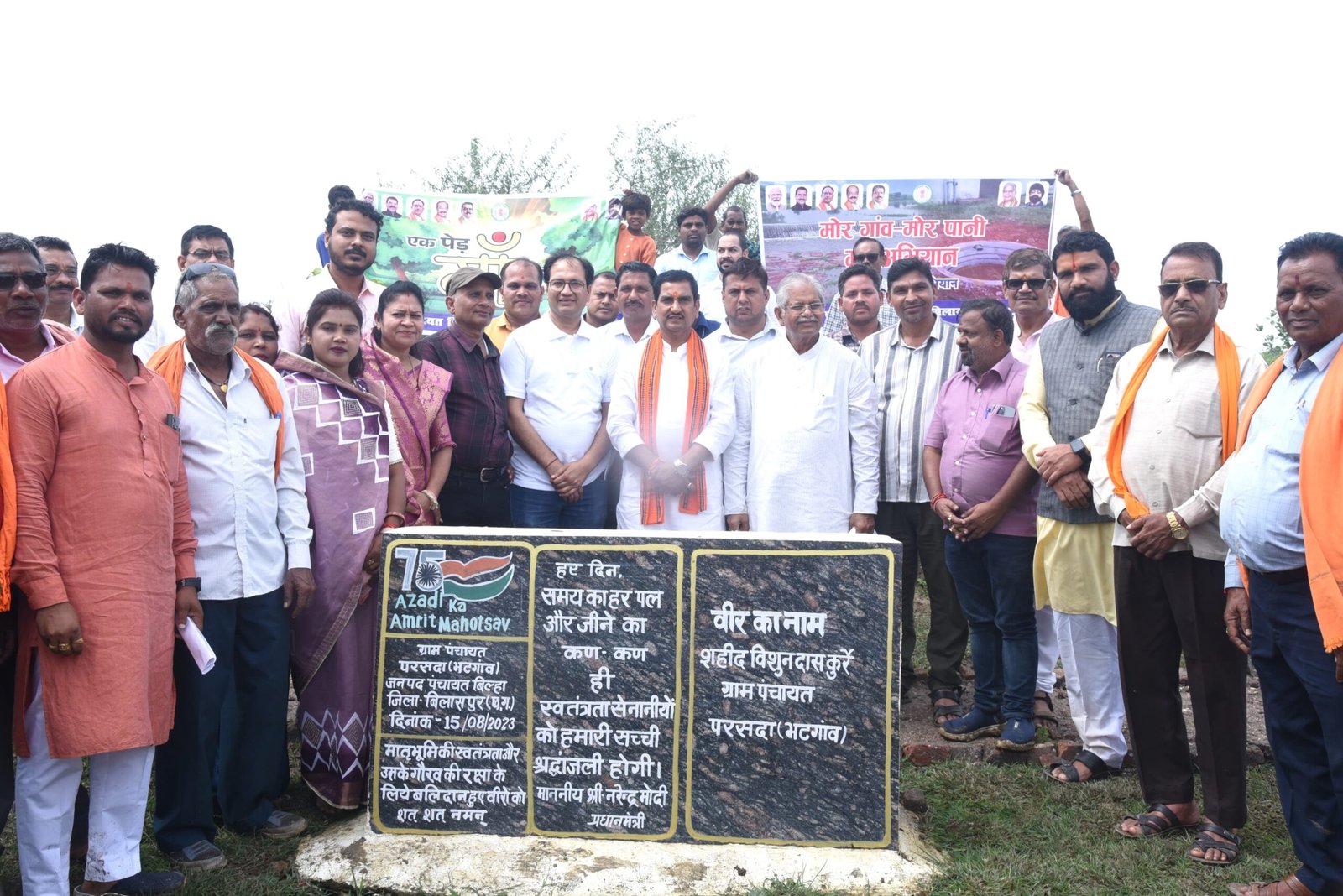 बिलासपुर :— केंद्रीय आवासन एवं शहरी विकास राज्यमंत्री तोखन साहू ने एक पेड़ मां के नाम अभियान के तहत बिल्हा ब्लॉक के परसदा(भटगांव) में पौधा लगाया। आज यहां आयोजित कार्यक्रम में बिल्हा विधायक श्री धरमलाल कौशिक, जनपद अध्यक्ष श्री राम कुमार कौशिक, कलेक्टर श्री संजय अग्रवाल सहित अन्य जनप्रतिनिधियों ने छायादार और फलदार पौधे लगाएं। जिले में आज वन, उद्यान, पंचायत एवं ग्रामीण विकास विभाग, नगरीय प्रशासन के सहयोग से सभी ब्लॉक मुख्यालय, स्कूलों, सड़क किनारे,आंगनबाड़ी केन्द्रों में सघन पौधरोपण अभियान चलाकर जिले में 3 लाख 72 हजार से ज्यादा पौधे लगाए गए। साथ ही साथ गोठानो में सीएलएफ के माध्यम से फलदार एवं छायादार पौधे लगाए गए। इसके अलावा उद्योगों में भी सघन पौधरोपण किया गया। रिमझिम फुहारों के बीच सभी ने पौधे लगाकर पर्यावरण सुरक्षा का संदेश दिया । कार्यक्रम में शहीद विशुनदास कुर्रे के परिवारजनों और बिल्हा ब्लॉक में 500 पेड़ लगाने वाले श्री हवेंद्र निर्णयजेक को सम्मानित किया गया।