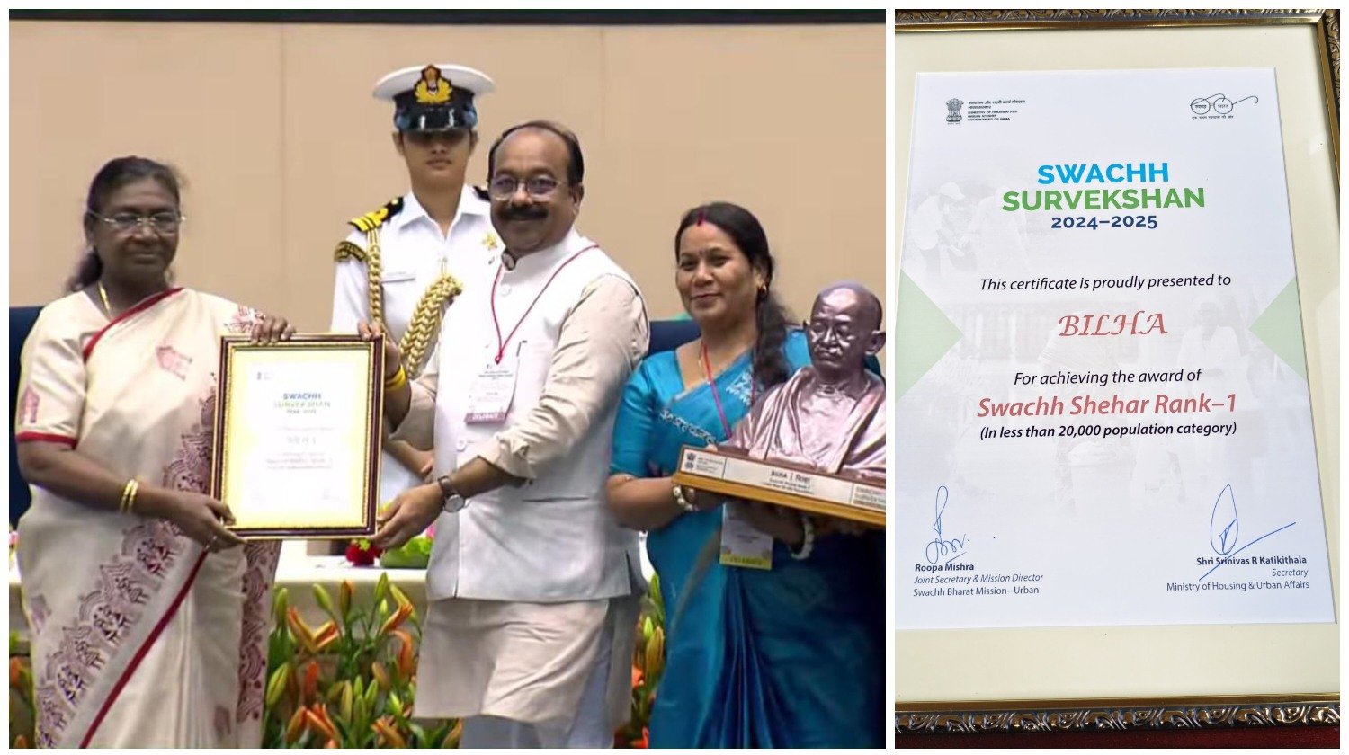 नई दिल्ली :— भारत सरकार शहरी एवं आवासन मंत्रालय के द्वारा स्वच्छता सर्वेक्षण 2024 -25 (9वा वर्ष) के अंतर्गत आज पुरस्कार समारोह में नगर पंचायत बिल्हा को 20000 से कम आबादी वाले शहरों में पूरे भारतवर्ष में स्वच्छता में पहला स्थान प्राप्त किया है ….