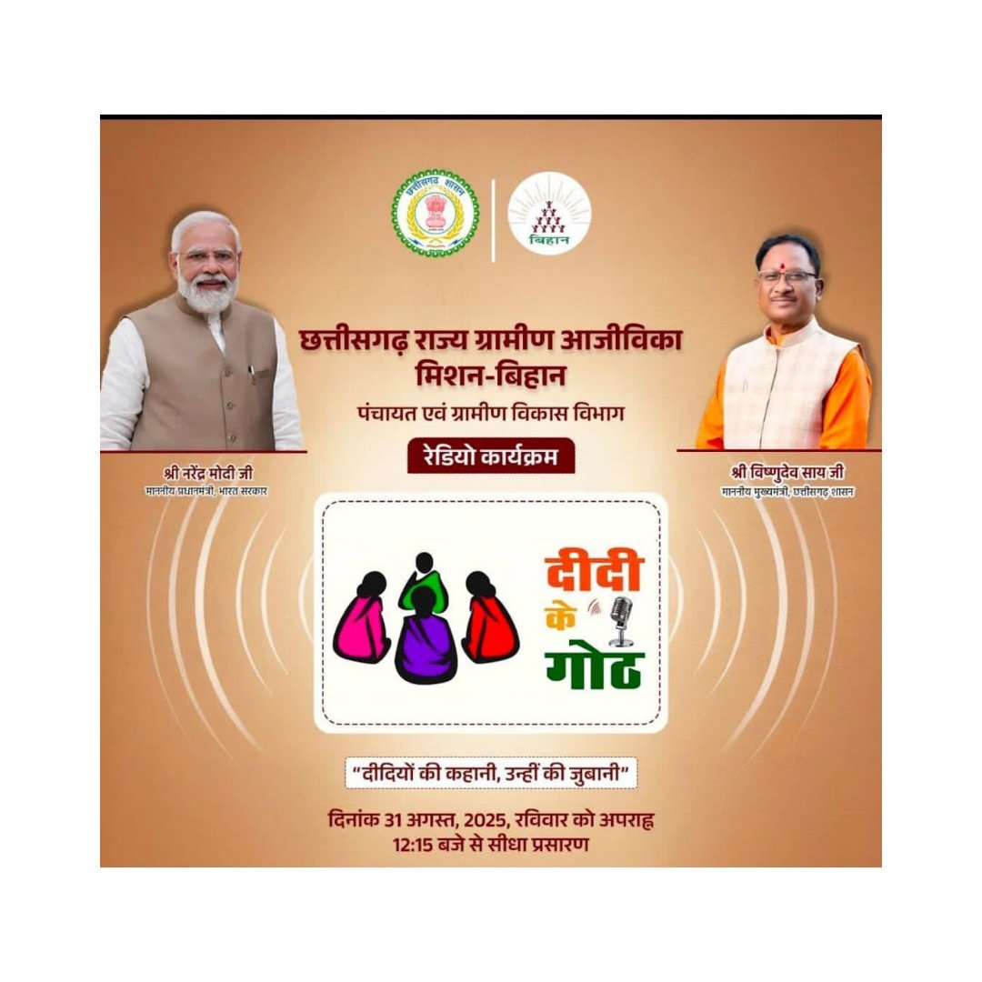 बिलासपुर // मुख्यमंत्री विष्णुदेव साय के नेतृत्व में सुशासन की सरकार ने छत्तीसगढ़ की ग्रामीण महिलाओं को सामाजिक, आर्थिक और पारिवारिक रूप से सशक्त बनाने की दिशा में एक और ऐतिहासिक कदम बढ़ाया है। राज्य ग्रामीण आजीविका मिशन (बिहान) के अंतर्गत तैयार विशेष रेडियो कार्यक्रम “दीदी के गोठ” का शुभारंभ 31 अगस्त 2025 को दोपहर 12:15 बजे किया जाएगा। यह कार्यक्रम आकाशवाणी रायपुर केंद्र सहित प्रदेश के सभी आकाशवाणी केंद्रों से एक साथ प्रसारित होगा। साथ ही इसकी लाइव स्ट्रीमिंग ऑनलाइन प्लेटफॉर्म (www.onlineradiofm.in/stations/all-india-air-raipur) पर भी उपलब्ध रहेगी,आकाशवाणी के बिलासपुर केंद्र से इस प्रसारण को 103.2 मेगा हर्ट्ज सुना जा सकेगा साथ ही लाइव स्ट्रीमिंग www.onlineradiofm.in/stations/all-india-air-Bilaspur के जरिए भी लोग कार्यक्रम से जुड़ सकेंगे।