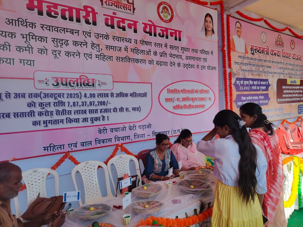 पुलिस मैदान में आयोजित राज्योत्सव में विभिन्न विभागों द्वारा लगाए गए 25 वर्षों की उपलब्धियों पर आधारित आकर्षक स्टॉल लगाए गए हैं, इसी क्रम में महिला एवं बाल विकास विभाग द्वारा लगाए गए स्टॉल में पोषण आहार एवं पारंपरिक व्यंजनों के माध्यम से लोगों को संतुलित भोजन के महत्व के बारे में बताया जा रहा है। साथ ही ‘बेटी बचाओ, बेटी पढ़ाओ’ अभियान के अंतर्गत बेटियों के शिक्षा एवं संरक्षण का संदेश प्रभावी रूप से दिया जा रहा है, जहां लोग सेल्फी लेकर इस संदेश का प्रचार कर रहे हैं।